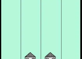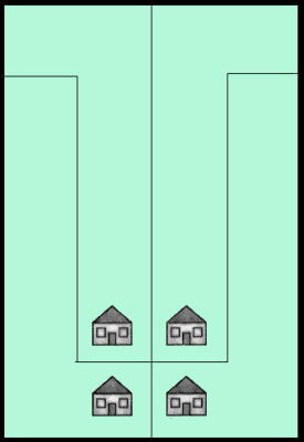 Ein Ehepaar hatte vier Kinder - es sind Vierlinge. Der Mann verstarb vor einigen Jahren. Die Frau erbte das untenstehende Grundstück mit den vier Häusern. Und sie machte sich Gedanken, wie sie das Grundstück mit dessen vier Häusern an ihre Vierlinge vererben könne, ohne irgendeinen der Vierlinge zu benachteiligen, denn die Häuser durften nicht abgerissen und neu gebaut werden und jedes der vier Häuser musste auf einem gleichgroßen Grundstück stehen.