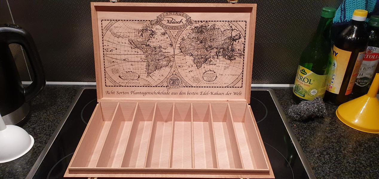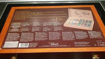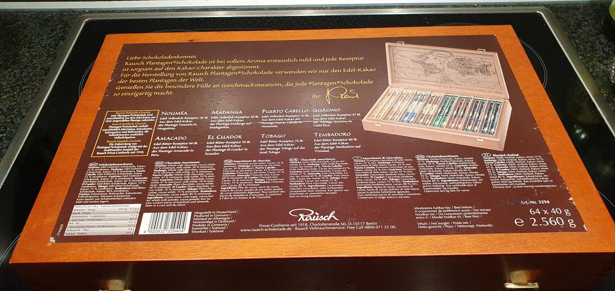 Sonn- und Feiertage: 12–20 UhrMeine ältere Tochter (Rechtpflegerin am Amtsgericht) hat in der Weihnachtszeit meist eine schöne Holzkiste mit verschiedenen Schokoladen geschenkt bekommen. LECKER.