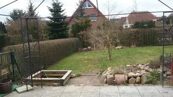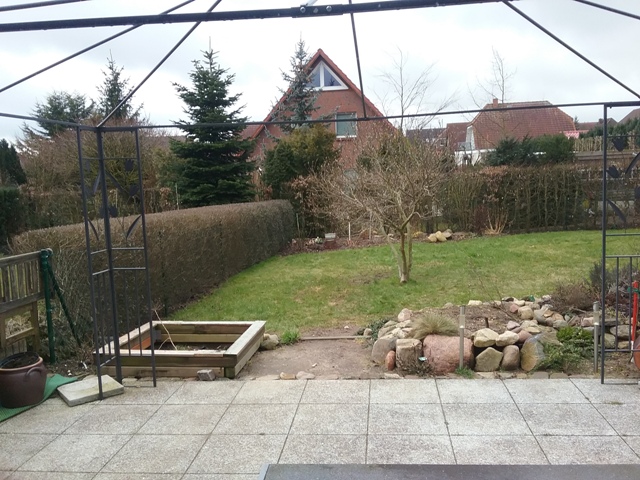 So sieht unser Garten (Fotografiert von der Terrassentür) zur Zeit aus. Alles wirkt noch ein wenig trostlos. Aber wenn erst mal alles anfängt zu blühen und zu grünen, finde ich unseren Garten schön.